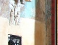 A predellán a Vir dolorum (fájdalmak férfija) látható : Jézust balról Mária, jobbról János fogja közre. Az oltár faragott oromzatának  ( restaurálása előtt 80%-ban megsemmisülve) alkotója ugyancsak a keresztrefeszítés történetét dolgozta fel .