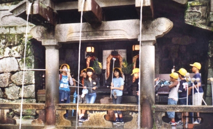 Kyomizudera -" a Tiszta víz " temploma . Hosszú sor kacskaringózik a csodatevő víz forrásánál, aki végre bekerül , jól kipancsolja magát ...
